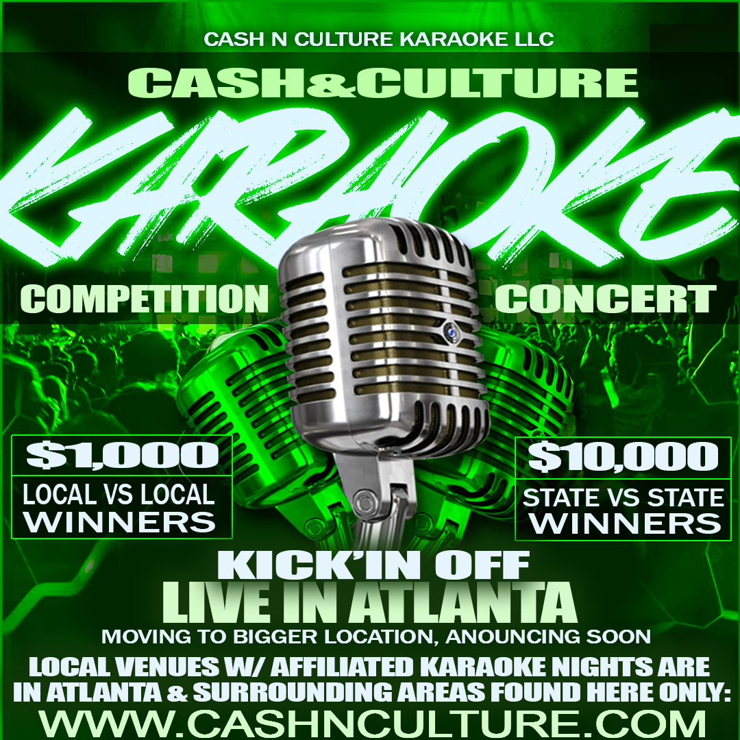 You asked for it!!! … We heard & we brought it back!!! Introducing the all newly improved CASH n CULTURE KARAOKE Competition. Karaoke lovers are taking over Atlanta, GA & surrounding cities to compete to win this ((( CASH N CULTURE KARAOKE … $1,000 local prize & $10,000 state prize cash ))) … FIND FULL DETAILS BELOW: