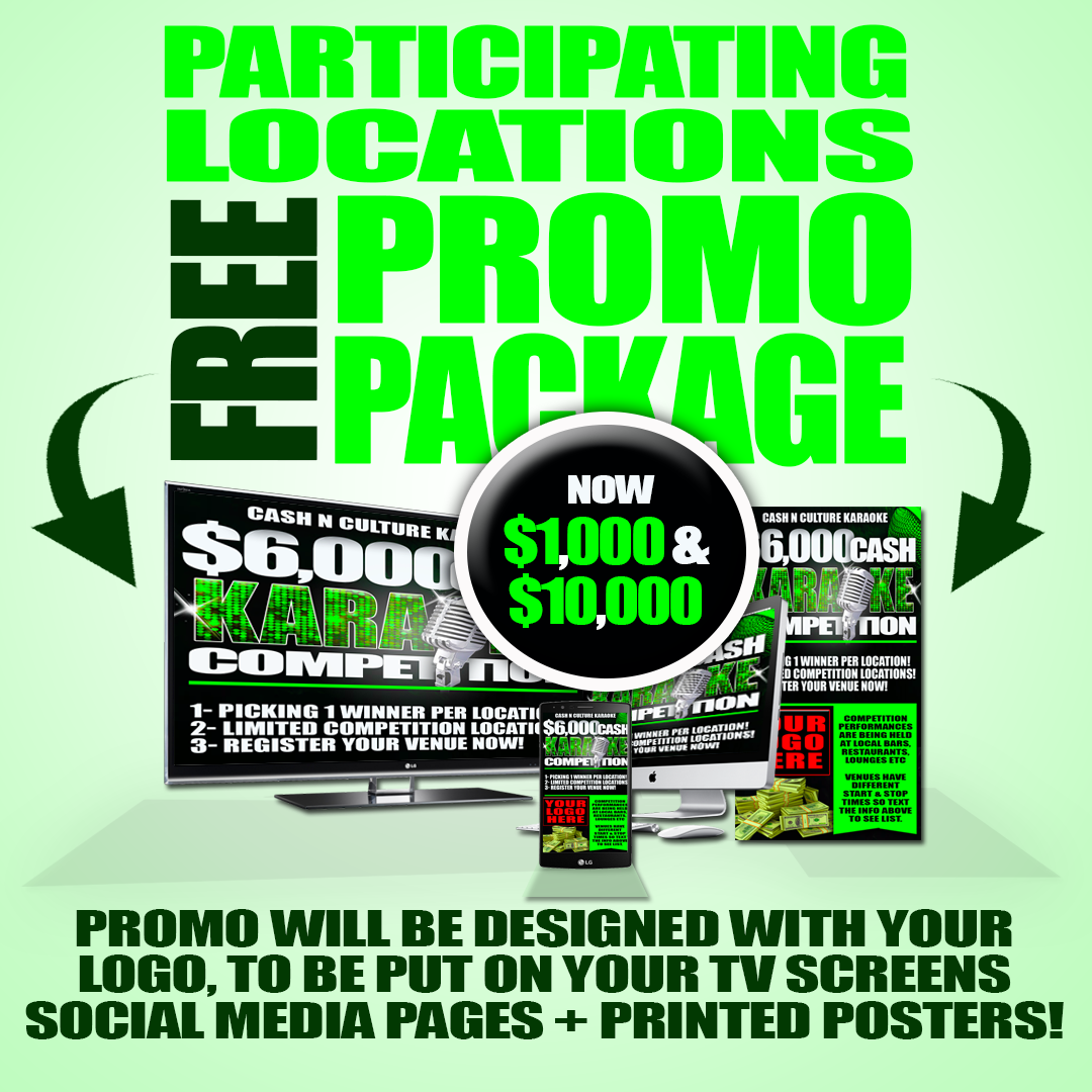 OUR MASSIVE PROMOTIONS IS SURE TO HAVE THE WHOLE CITY LOOKING FOR CERTIFIED TRYOUT LOCATIONS. CERTIFIED LOCATIONS ARE PLACED ONLY ON OUR WEBSITE “WWW.CASHNCULTUREKARAOKE.COM” & IN PROMOTIONS. IT IS A REQUIREMENT OF ALL PARTICIPANTS AND STAFF TO CHOOSE THE LOCATION IN WHICH THEY WILL SERVE & COMPETE. VENUES/HOSTS MUST ALLOW FREE ADMISSION AND FREE SIGN-UP FOR KARAOKE PARTICIPANTS, STAFF ECT AND PREFFERABLY TO ALL GUESTS WHICH ONLY INCREASE THE CHANCES OF CUSTOMERS CHOOSING YOUR LOCATION.